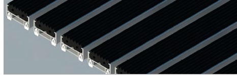 Felpudos lavable y original para zonas de paso elevadas, a base de bandas de fibras 100% polipropileno entre las cuales se han insertado bandas de aluminio de alta resistencia.