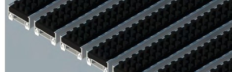 Felpudos lavable y original para zonas de paso elevadas, a base de bandas de fibras 100% polipropileno entre las cuales se han insertado bandas de aluminio de alta resistencia.